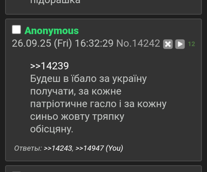 >Бачу, що модератор забанив на 10 тижнів за причиною: Abuse, offtop. Модератору пригорело от правды (тм) которая у каждого своя и меня активно попытались выписать из Украинцев, не смогли, после чего забанили. Я никого не абузил и тем более не офтопил, максимум - отвечал на оскорбления в мою сторону. Если у части беженцев с доллчана не выдерживает задний ум от моих постов они могут просто добавить меня в скрытие.