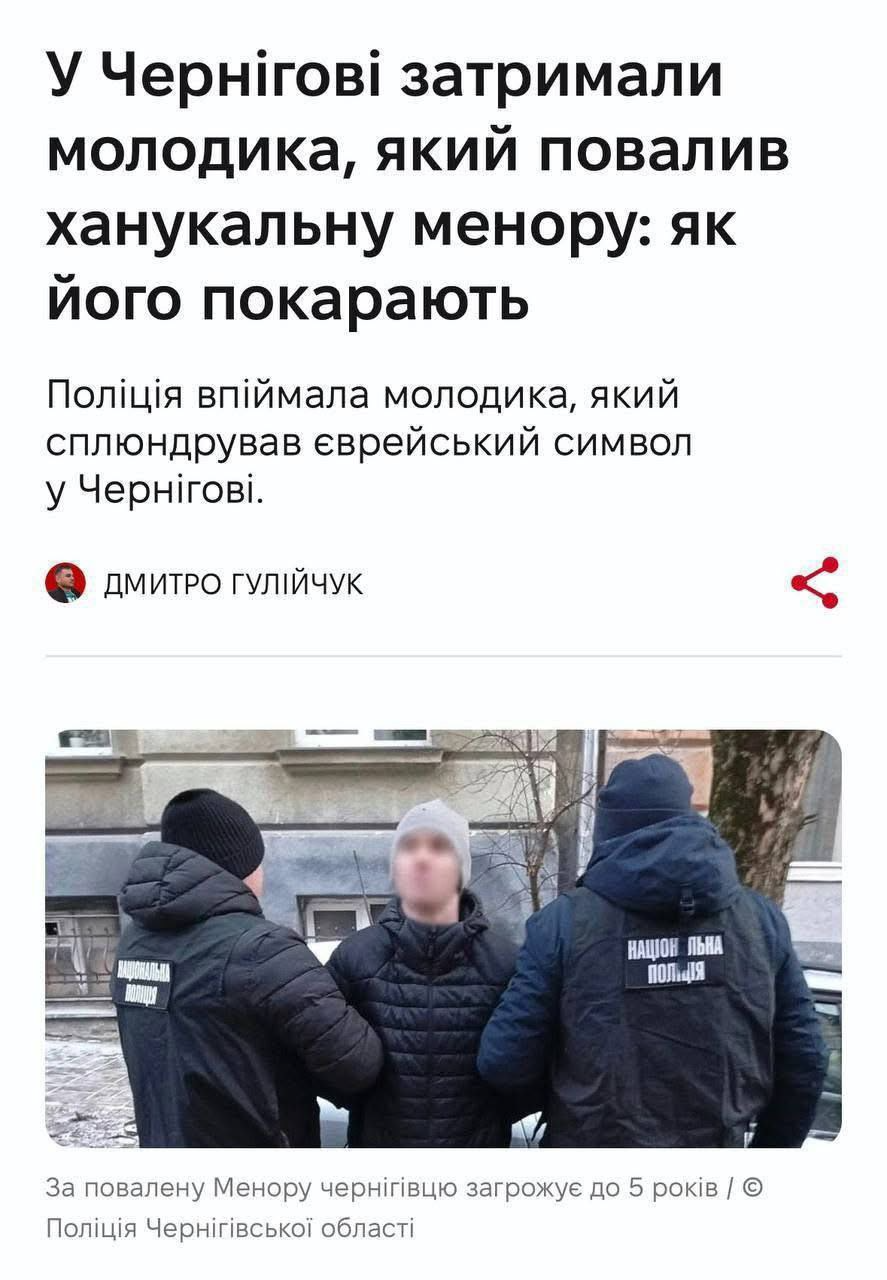 В Чернигове повредили Менору – мужчина сразу задержан.