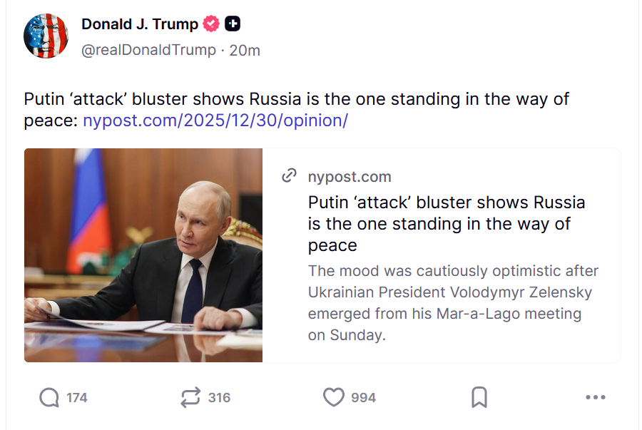 >>237765Трамп репостнул редакционную статью New York Post с заголовком: «Заявление об «атаке» на Путина показывает, что именно РФ мешает миру».