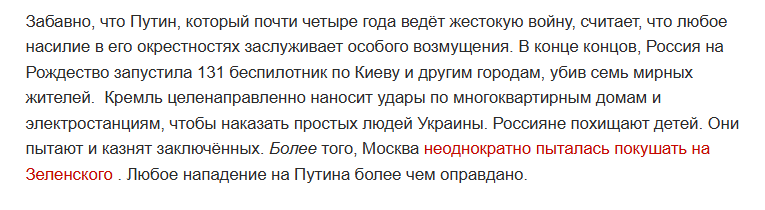 Издание пишет, что «любое нападение на Путина более чем оправдано».
