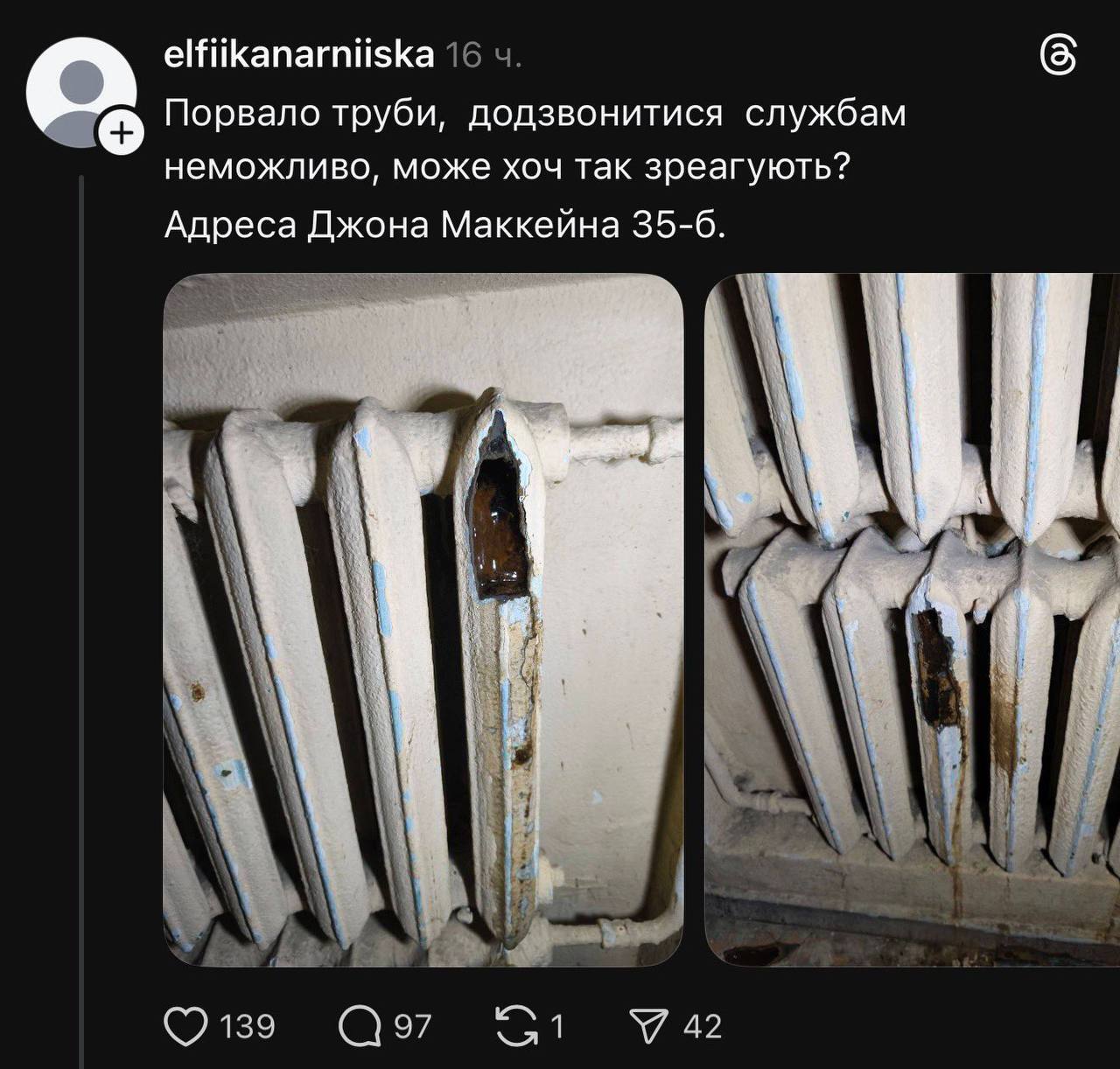 "Не перестаю дивуватись наскільки глибоко похуй військово-політичному керівництву держави на життя власних жінок та дітей. Я розумію, що нас, Сили оборони України, вже давно поховав в братській могилі вищий сорт «українців» з горбатенькими носами, і вихід з гри у нас або через трубу крематорію, або через невідкладну операційну палату. Але чи бачить і знає Зеленський, що в трьохстах метрах від урядового кварталу — температура в квартирах біля нуля, а в ЖК напроти «Охматдиту» полопались санвузли через обледеніння труб? Зробили з половини українців безхатченків, і далі крокують тим самим темпом, змінюючи лише рильця біля корита… У мене періодично питають: «а чи зміниться щось десь у звʼязку з приходом?», «а цей голова краще ніж отой?».