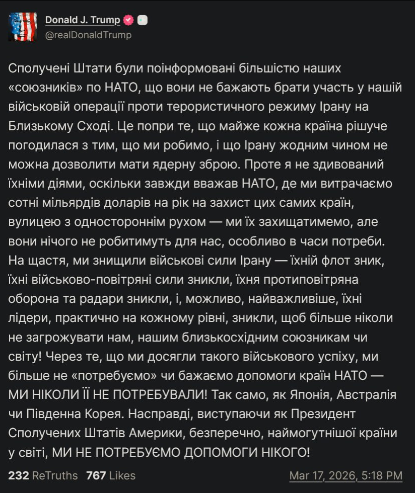 Соединенные Штаты Америки победили и полностью уничтожили Иран, как в военном, экономическом, так и во всех других отношениях, НО страны мира, которые получают нефть через Ормузский пролив, должны позаботиться об этом проходе, и мы поможем — МНОГО! США также будут координировать свои действия с этими странами, чтобы все прошло быстро, гладко и хорошо. Это всегда должно было быть командным усилием, и теперь это будет — это объединит Мир к гармонии, безопасности и вечному миру! Президент Дональд Дж. ТРАМП