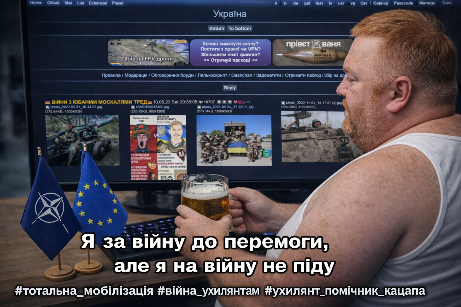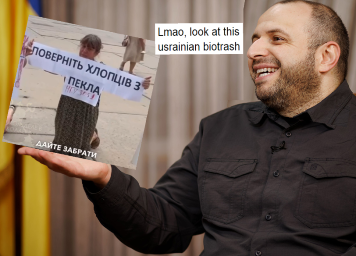 Ти виглядаєш як дешевий порноактор, якого запросили знятися в ролі «хороброго слов’янина», але забули видати нормальний сценарій і нормальний хуй. Тому ти просто стоїш, сльози котяться, соплі течуть, а в роті тільки одне слово — «підтримка».