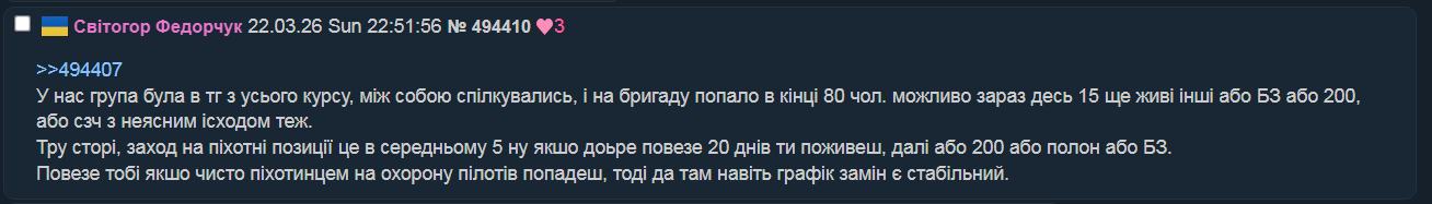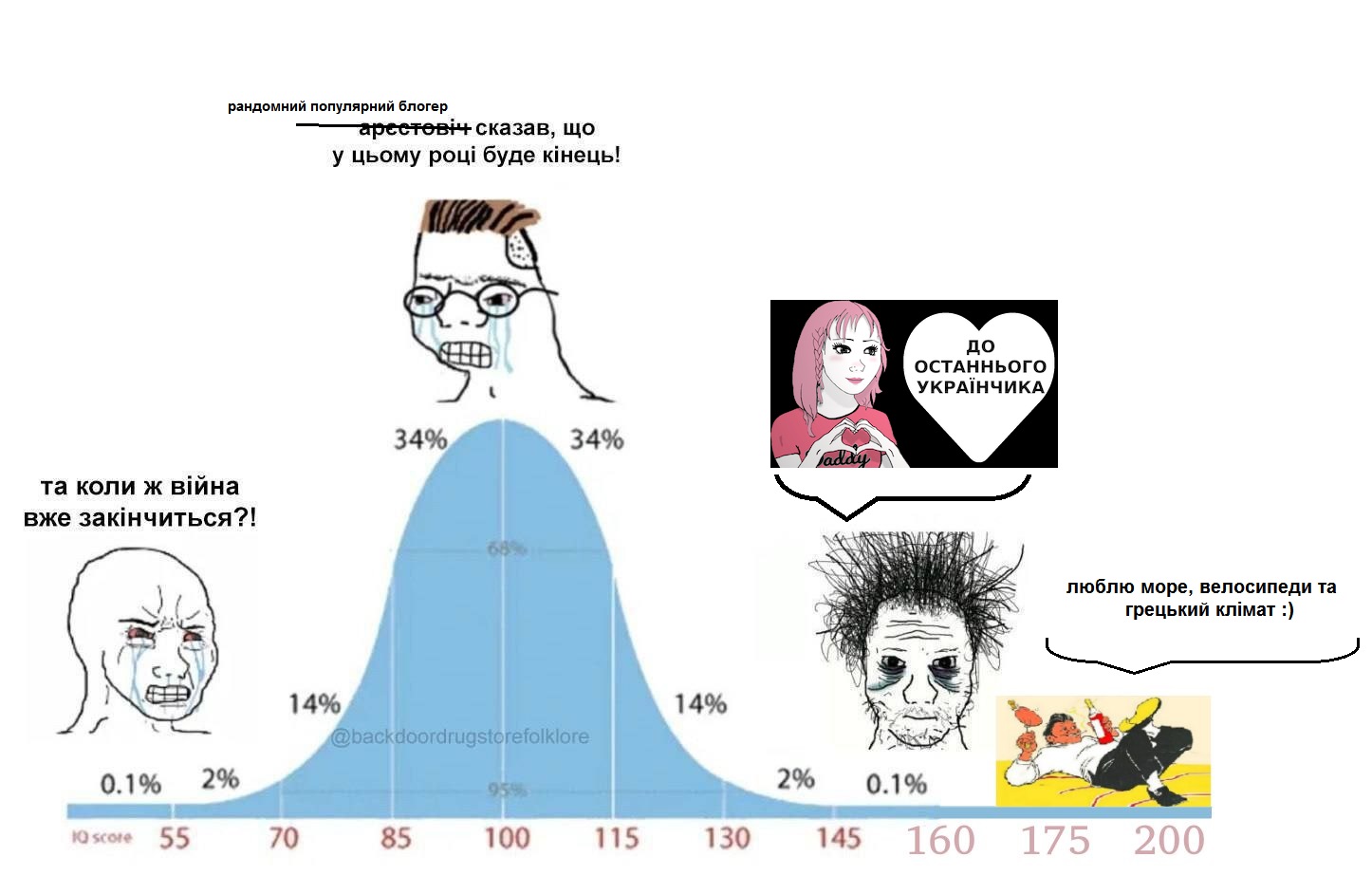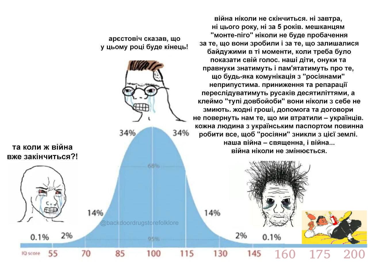 >>259160>2022: на твою країну нападають, це абсолютна війна на виживання>ти віддаєш останні заощадження на армію, віриш у справедливістьТы в начале 22-го на форумах пишешь, что хотят или нет никаких перемог не будет, а всё равно будет договорнячок, тебя и ещё человека 2-3 постоянно банят пока все витают в перемогах.
