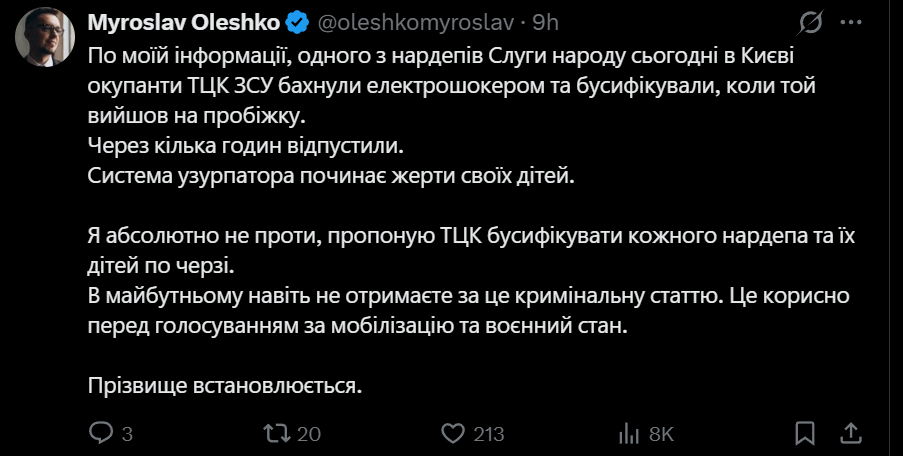 В Украине действуют банды, переодетые в форму, которые хватают людей на улицах, заталкивают в бус и вымогают деньги, угрожая отвезти в ТЦК, — нардеп Княжицкий