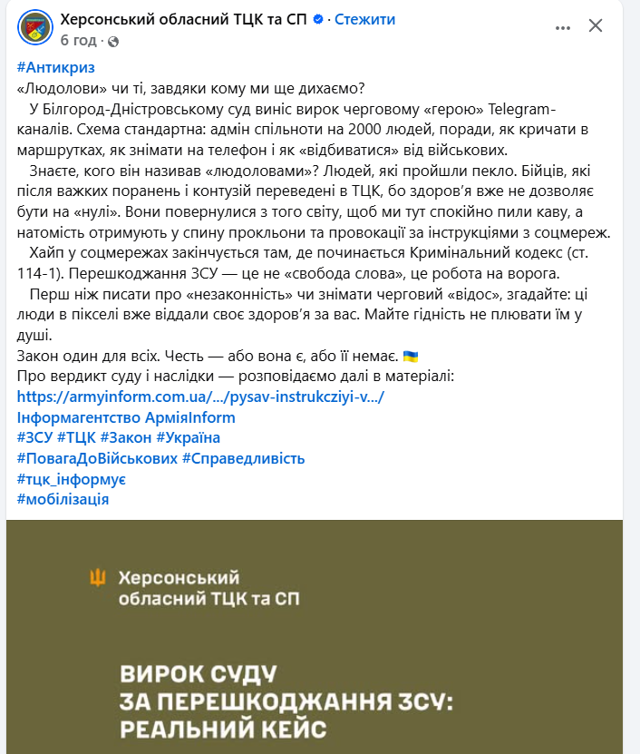 У Білгород-Дністровському суд виніс вирок черговому «герою» Telegram-каналів. Схема стандартна: адмін спільноти на 2000 людей, поради, як кричати в маршрутках, як знімати на телефон і як «відбиватися» від військових.